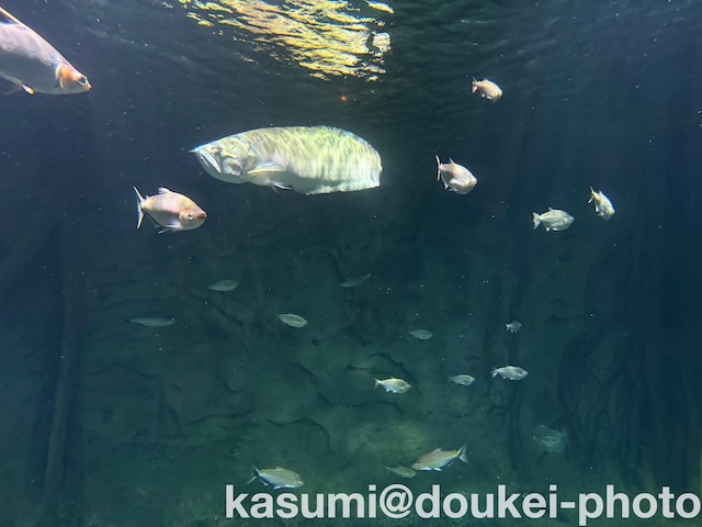 A large aquarium has pirarucu.
